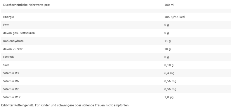 Wasser, Zucker, 5% Fruchtsaft aus Fruchtsaftkonzentraten (Apfel, Pfirsich, Birne, Ananas, Nektarine, Mango, Banane), Glukosesirup, Kohlensäure, Säuerungsmittel (Citronensäure), Taurin (0,4%), Säureregulator (Natriumcitrate), Aromen, Maltodextrin, Konservierungsstoff (Kaliumsorbat), Koffein (0,03%), Pflanzliche Öle (Kokosnuss, Raps), Modifizierte Stärke, Vitaminmischung (Nicotinamid, Vitamin B6, Riboflavin, Vitamin B12), Süßungsmittel (Sucralose), L-Carnitin-L-Tartrat (0,004%), Salz, Inosit (0,002%), Farbstoff (Carotin).