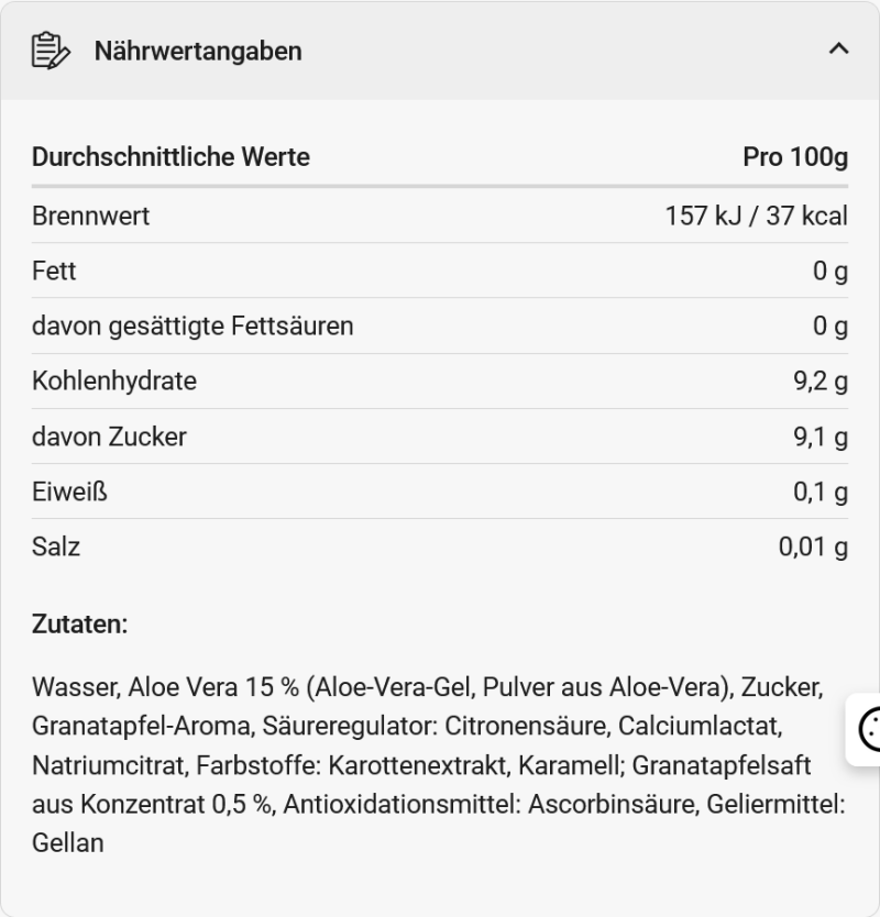 - Aloe Vera Getränk mit 15 % Aloe Vera und Granatapfelsaft