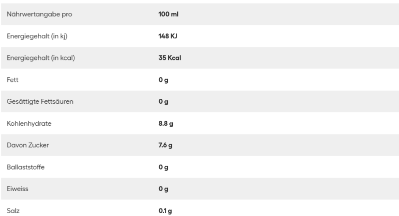 Wasser, Zucker, 5% Fruchtsaft aus Fruchtsaftkonzentraten (Apfel, Sauerkirsche, Schwarze Johannisbeere, Brombeere), Glukosesirup, Geschmacksverstärker (Erythrit), Kohlensäure, Säuerungsmittel (Citronensäure, Äpfelsäure), Taurin (400 mg/ 100 ml), Säureregulator (Natriumcitrate), Aromastoff Panax Ginseng Wurzelextrakt (85 mg/ 100 ml), Aromen, Konservierungsstoff (Kaliumsorbat), Koffein (32 mg/ 100 ml), Schwarzes Karottensaftkonzentrat, Süssungsmittel (Sucralose), Pflanzliche Öle (kokosnuss, Rapssamen), Vitamine (niacin, b6, b12), modifizierte stärke, natriumchlorid, guaranasamenextrakt (2 mg / 100 ml), inosit (2 mg/ 100 ml), farbstoff (riboflavin).